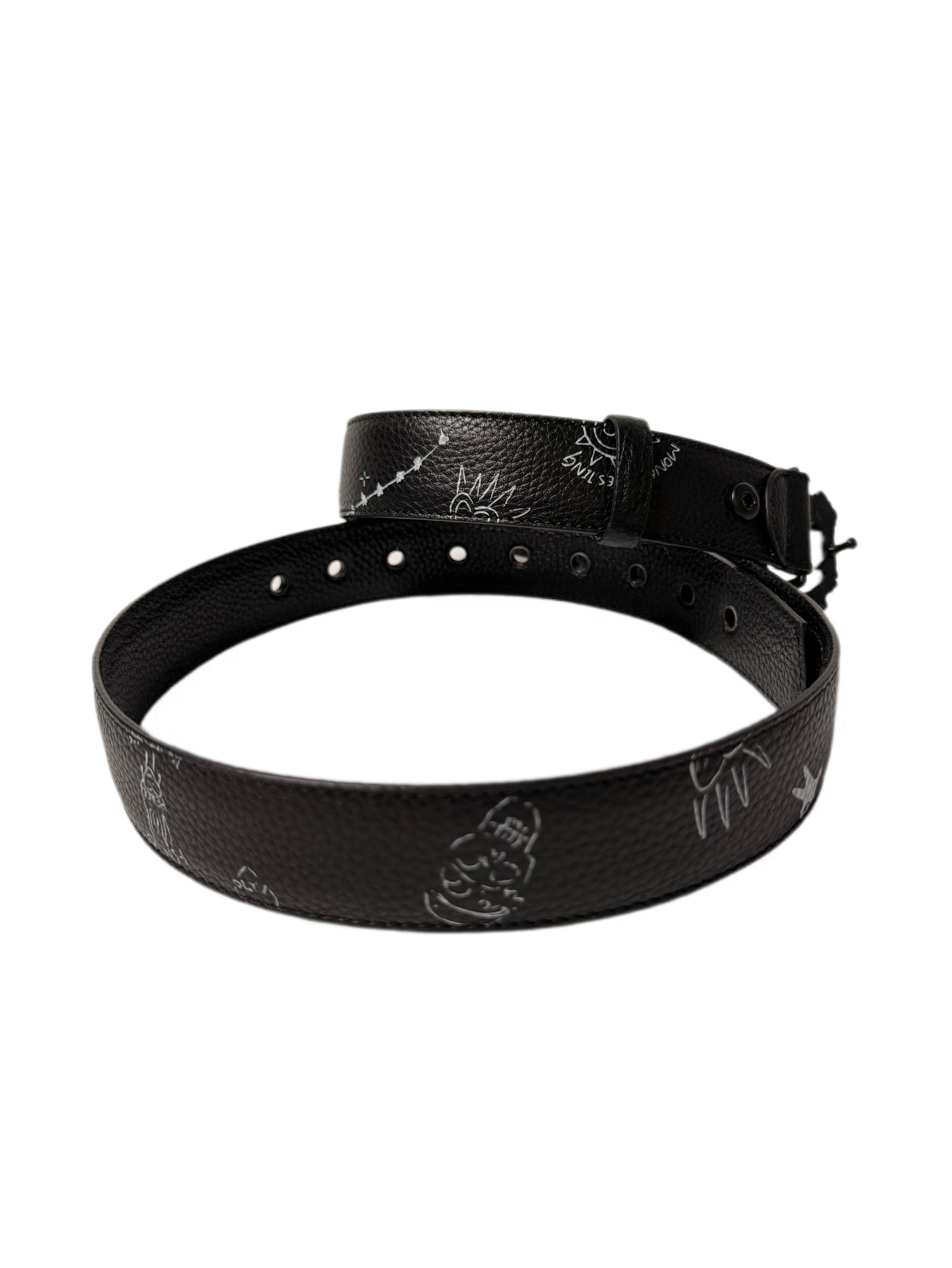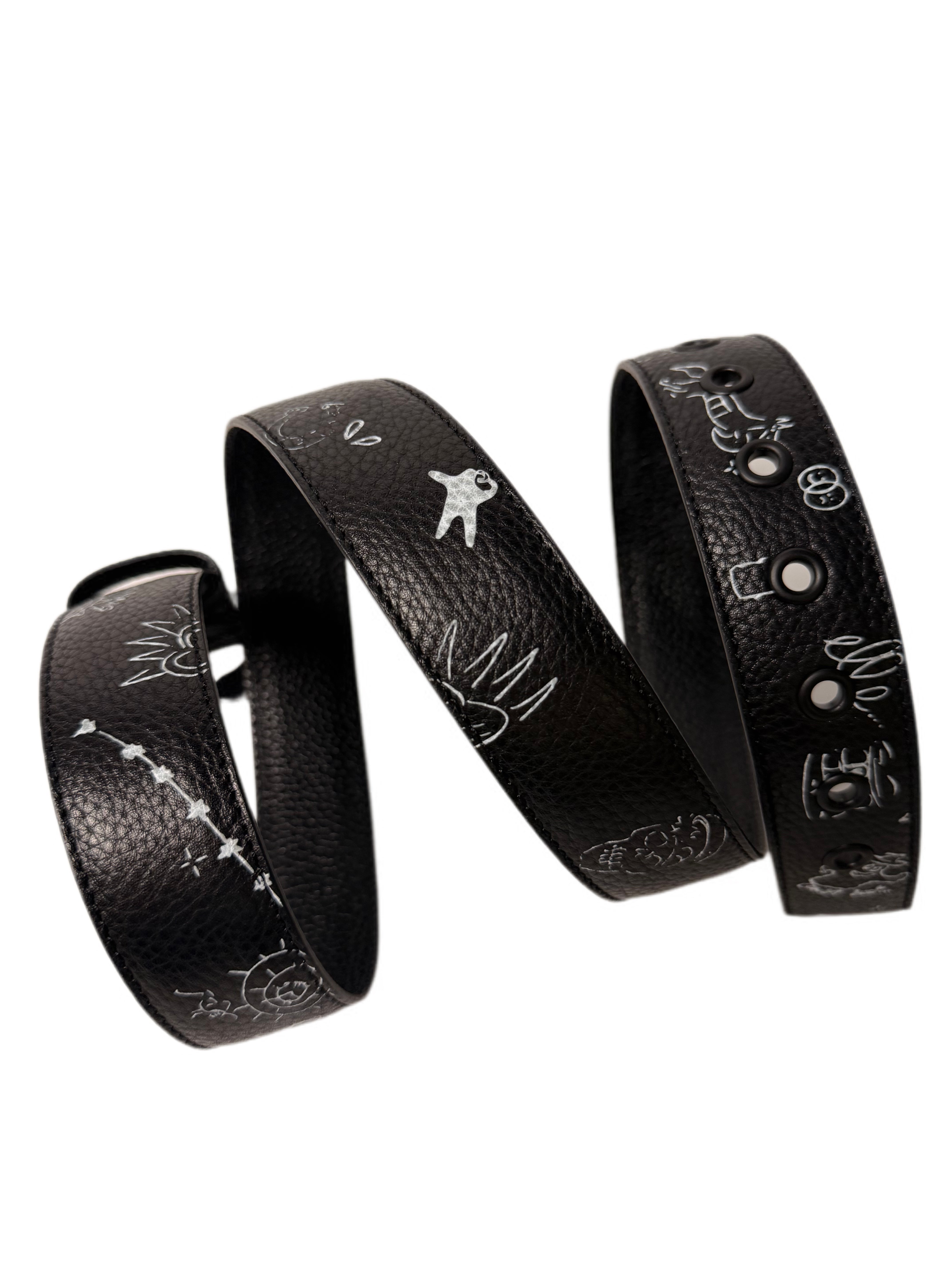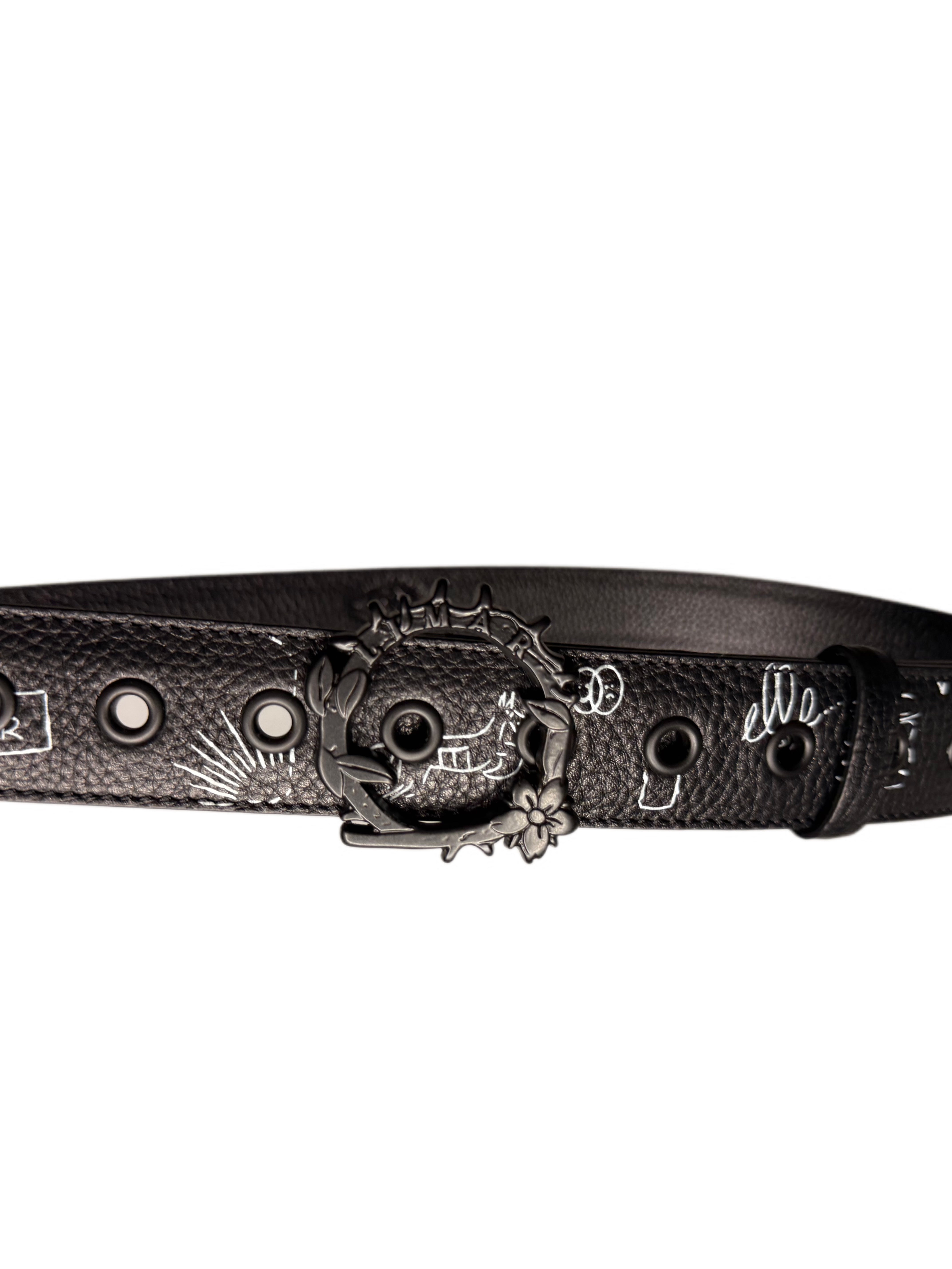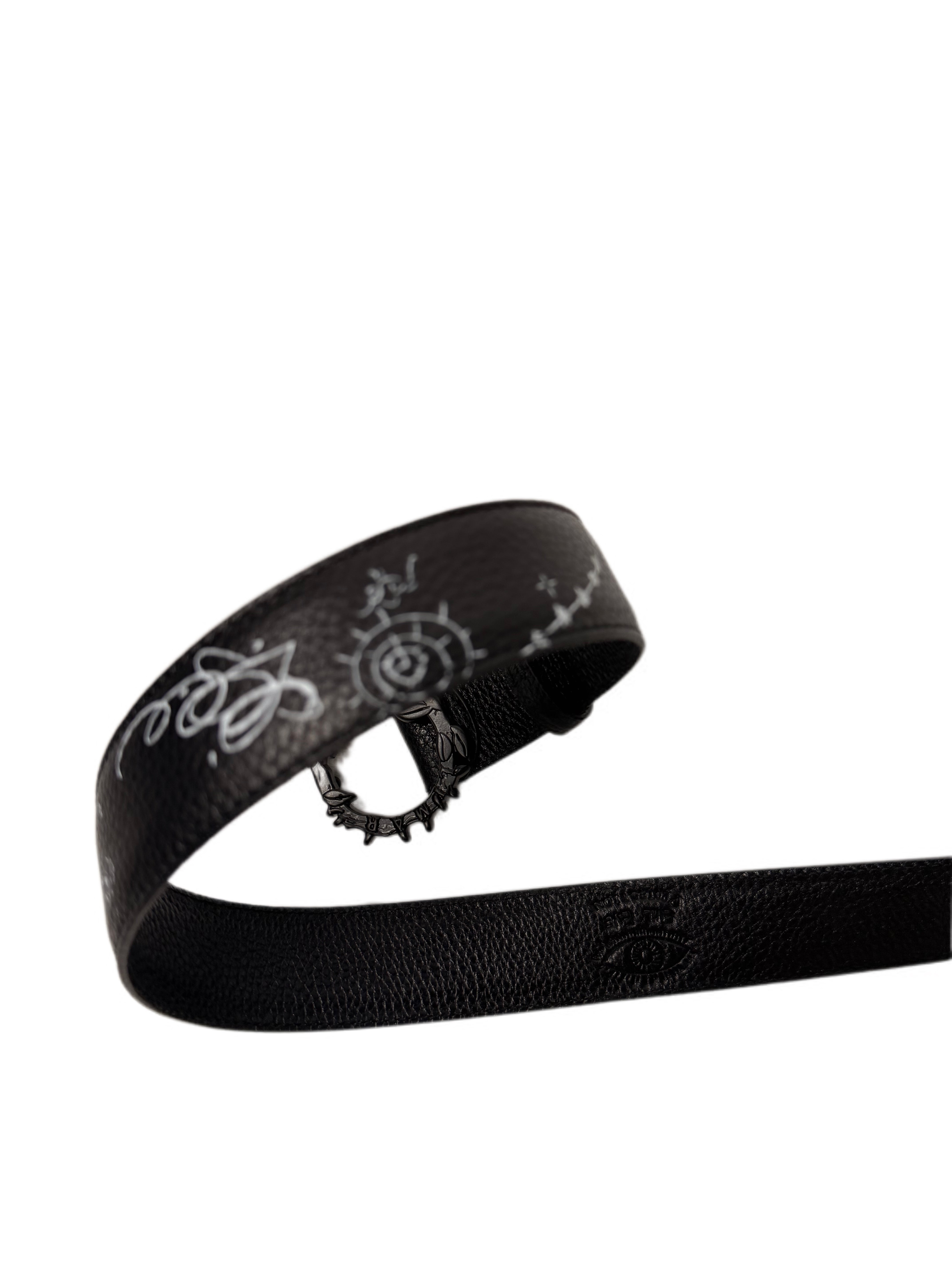 The LIMAR Rebel Leather Belt transforms everyday wear into a canvas of emotion and artistry. Crafted from smooth black leather and detailed with white hand-drawn sketches, it captures LIMAR’s signature mix of edge and meaning. The sculptural black matt thorn buckle wraps the design in strength and protection, balancing boldness with refinement.