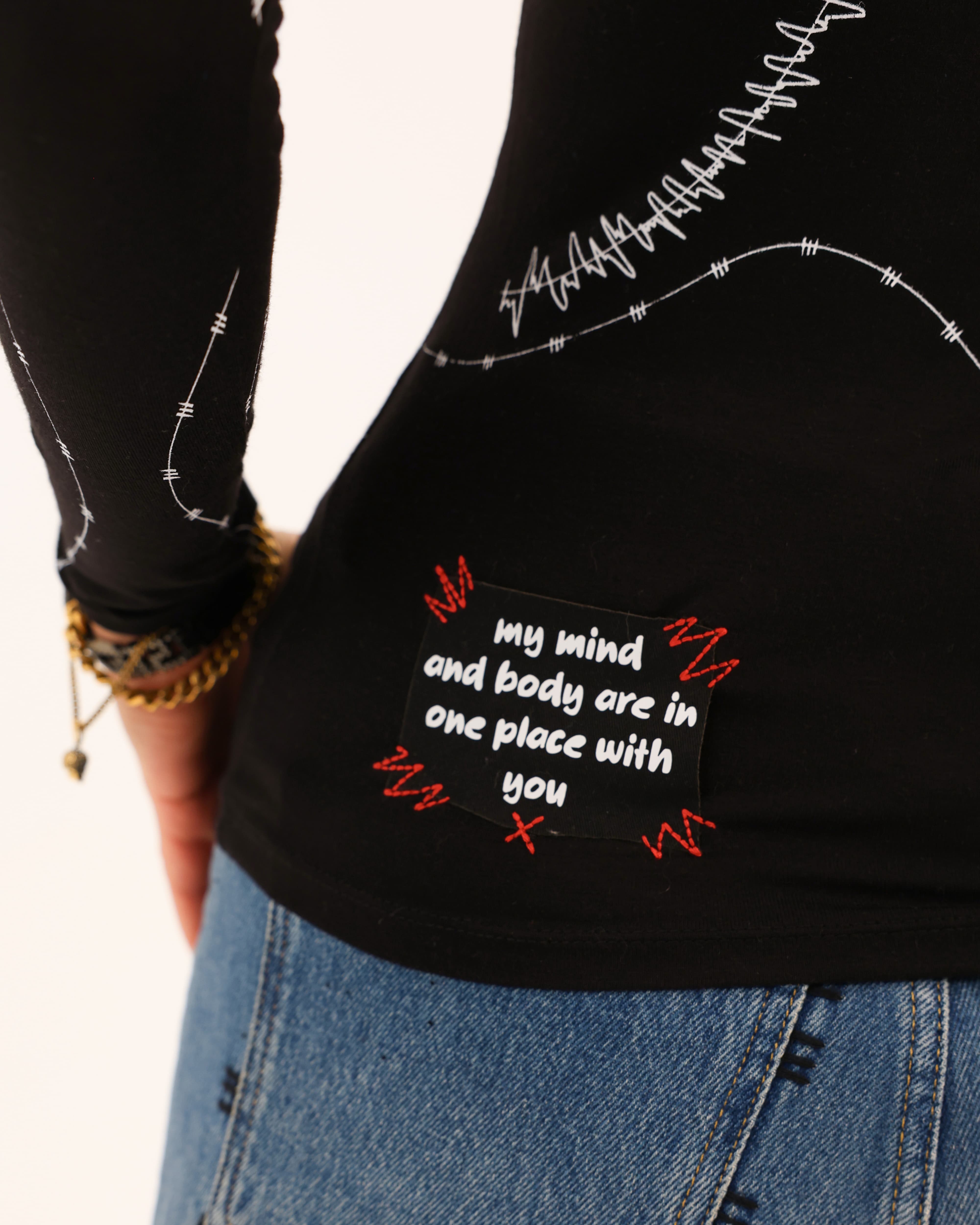 This statement fashion piece features an embroidered eye on the sleeve and a thoughtful patch reading “my mind and body are in one place with you.” Black symbolizes grounded power and quiet confidence, making it perfect for anyone who values style, mindfulness, and self-expression.