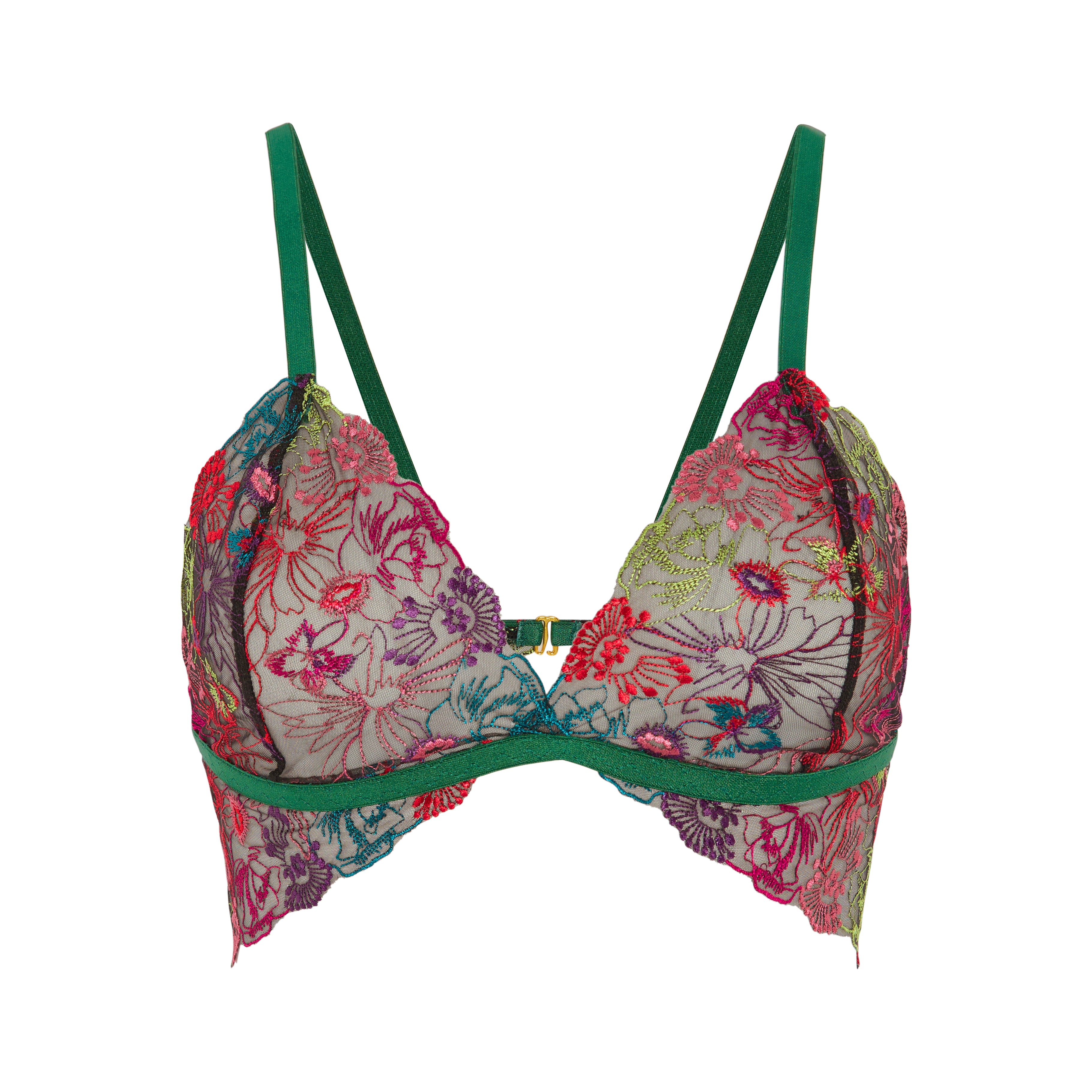 Handmade with care, the bralette combines lightweight mesh and soft satin trims to provide a comfortable, flattering fit. The green satin edging frames the silhouette, offering structure while enhancing the natural curves.